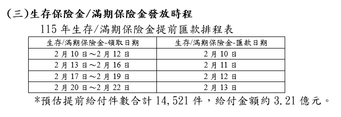 因應春節連續假期並協助保戶資金運用,三商美邦人壽已於114年12月主動寄發提前給付生存/滿期保險金通知書予保戶,並將提前給付生存/滿期保險金,只要是生存/滿期保險金領取日期為115/02/10-115/02/22之保單,並依通知書上所載時間內回覆,該公司將提前自115/02/10至115/02/13開始發放,總計有14,521件保單,給付金額約3.21億元。期能提供保戶更便利之服務,達到保戶靈活運用資金之目的。